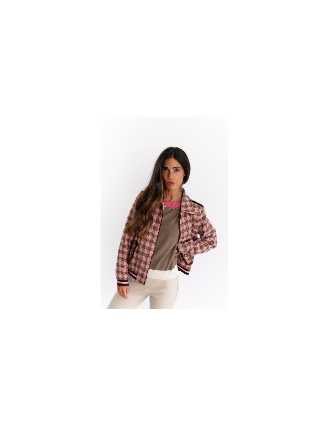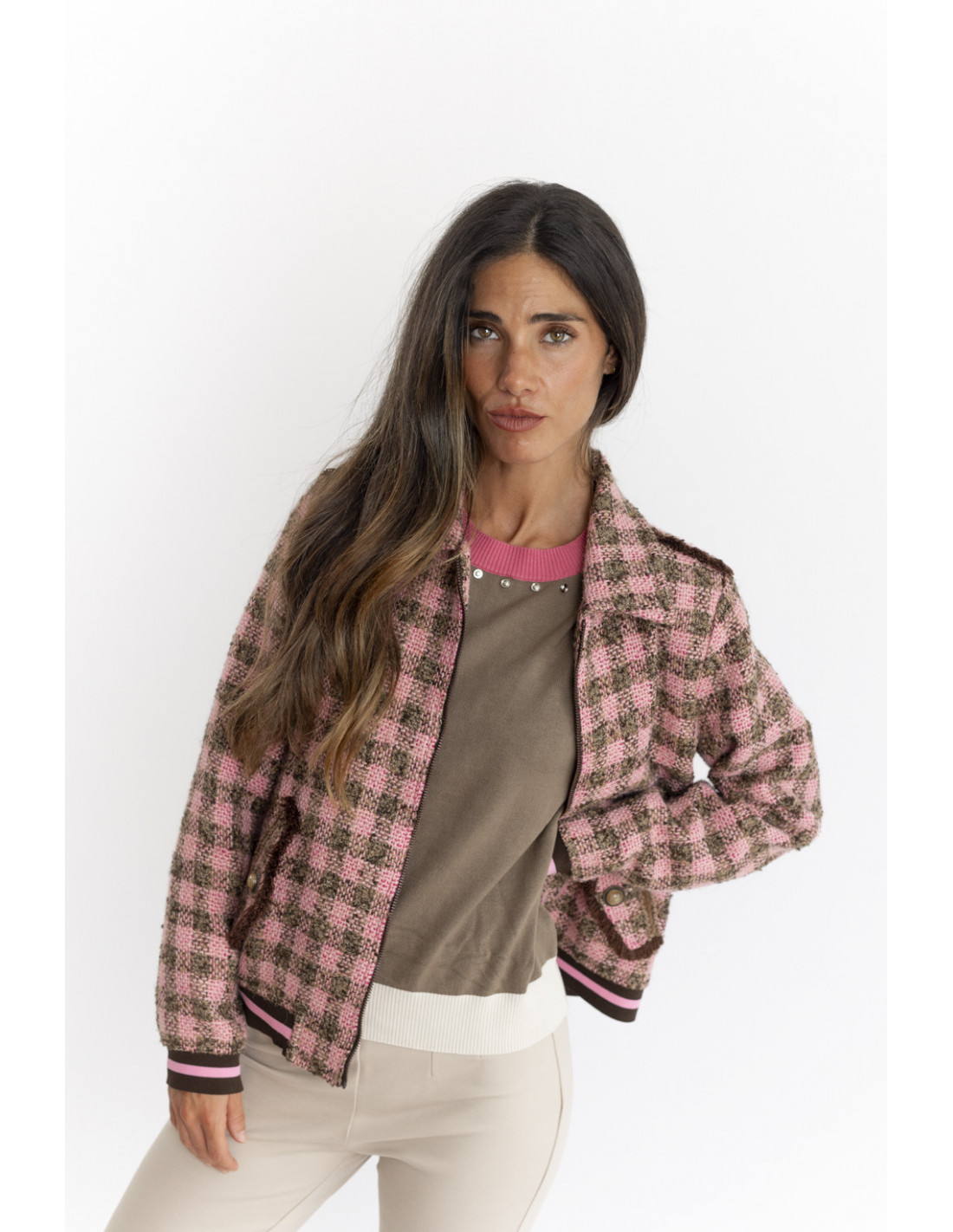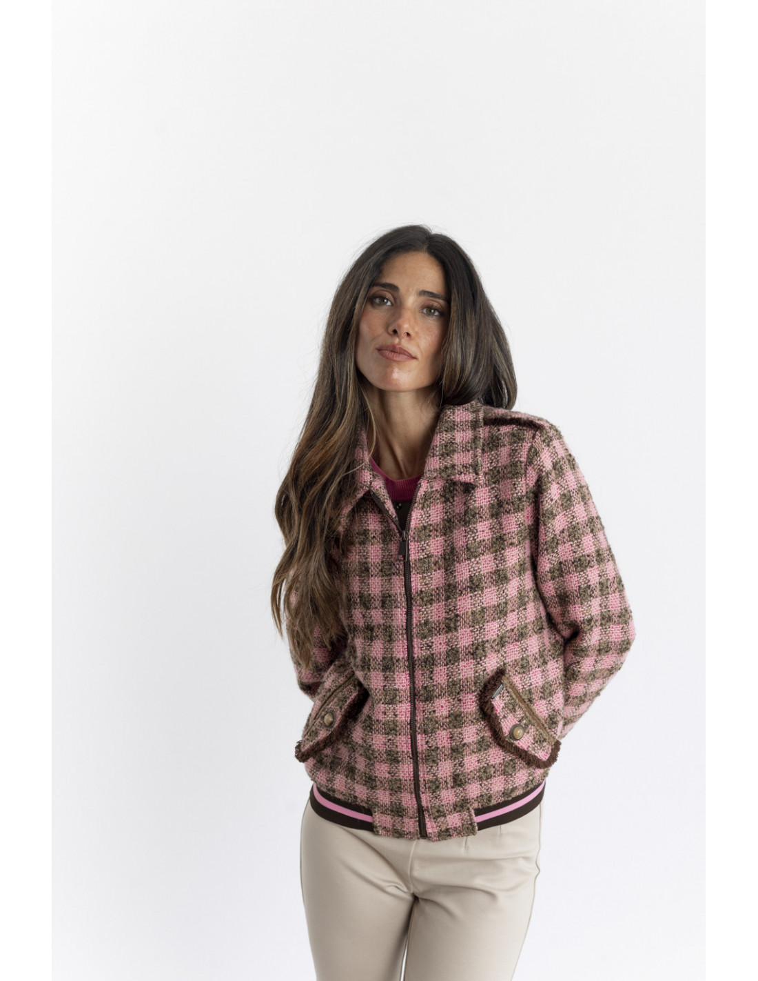 Nuestra bomber de cuadros es una de esas prendas que no pasa desapercibida. Con un diseño lleno de personalidad, mezcla elementos clásicos como el cuello camisero y el estampado de cuadros con detalles únicos: elásticos de rayas en contraste, flecos decorativos en los hombros y la cremallera, y una aplicación en forma de corazón marrón en la espalda que le da un toque inesperado y especial.