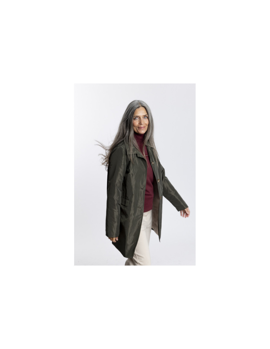 Una prenda esencial del armario femenino, reinventada con un toque moderno. Esta trench de corte clásico destaca por su tejido técnico con ligero brillo, que aporta un acabado elegante y sofisticado, ideal tanto para looks formales como casuales.