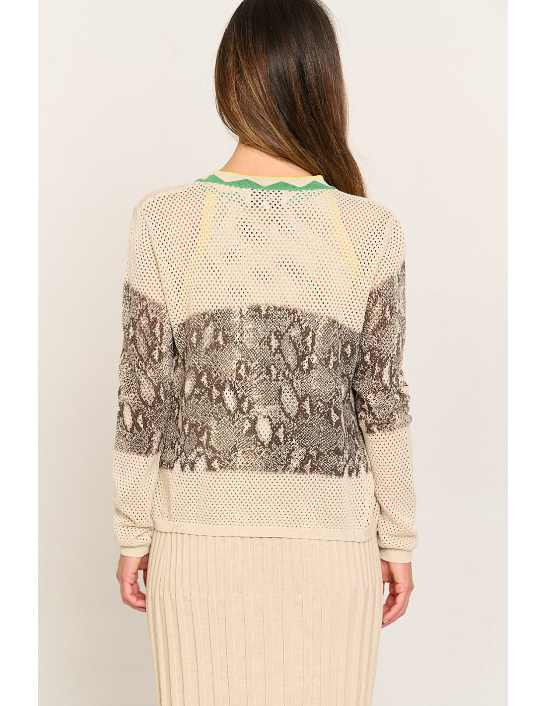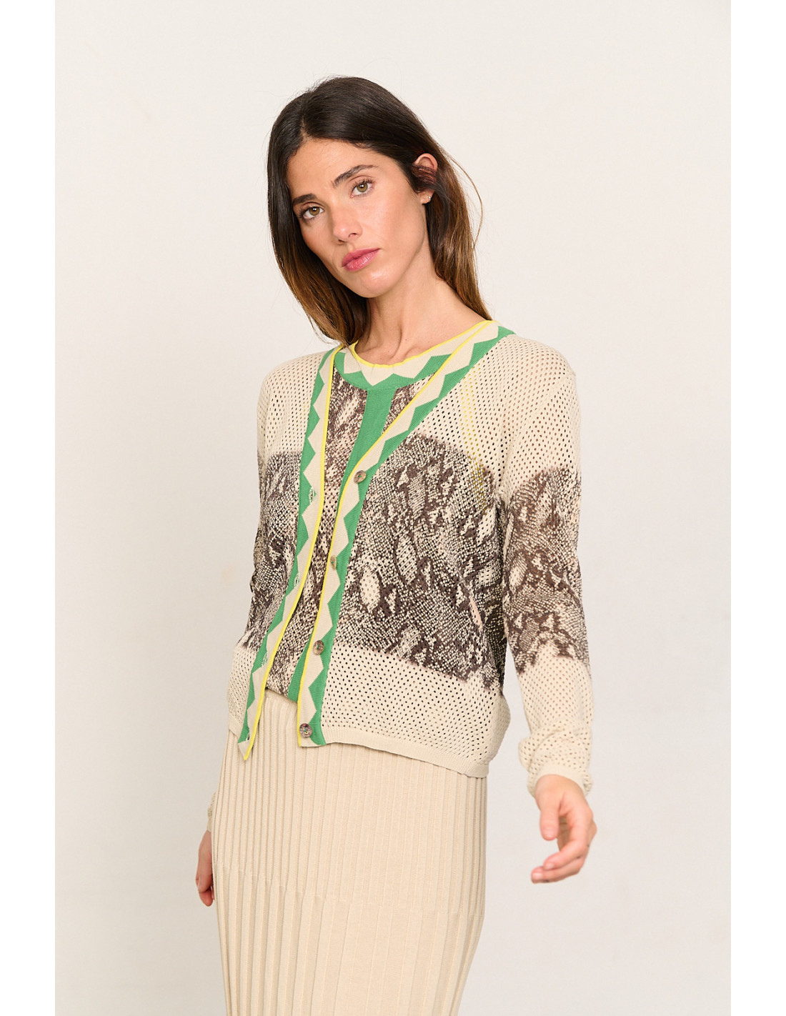 Esta chaqueta de algodón con certificado GOTS es una prenda especial y fresca diseñada para los días de calor. Confeccionada en un punto calado , combina la parte delantera con animal print y la parte trasera lisa que equilibra el diseño. Los contrastes coloridos añaden un aire alegre y moderno convirtiéndola en una elección perfecta para elevar cualquier look.
