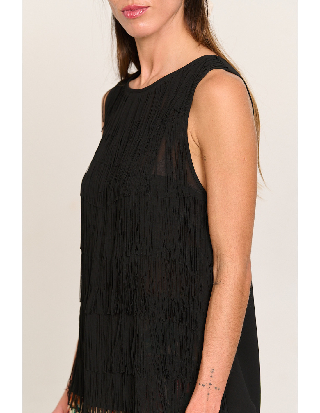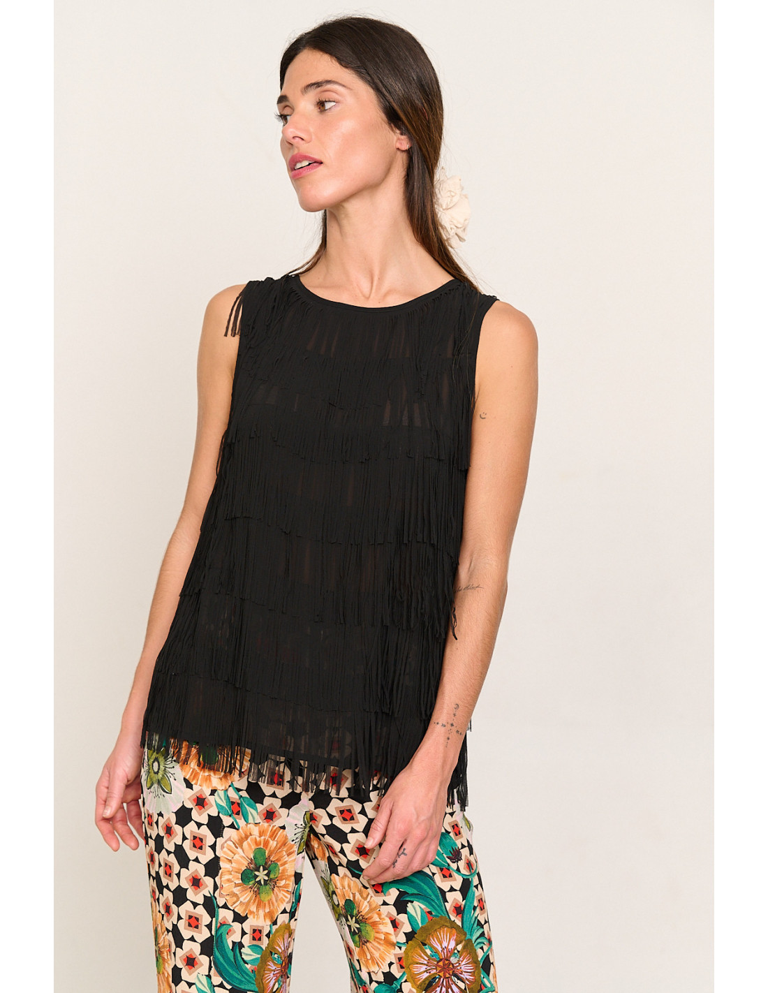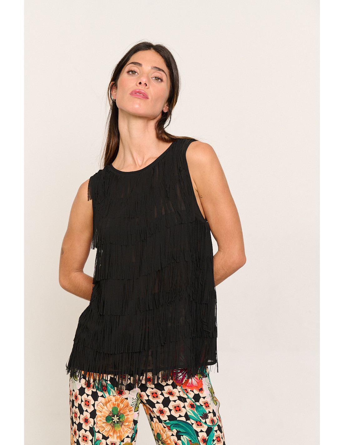 El top SARE es una opción moderna y llena de movimiento, perfecta para añadir un toque especial a cualquier conjunto. Su diseño destaca por los flecos en la parte delantera que aportan textura creando un efecto impactante a cada paso. Con un corte favorecedor y un estilo versátil, este top es ideal tanto para eventos especiales como para elevar looks casuales.