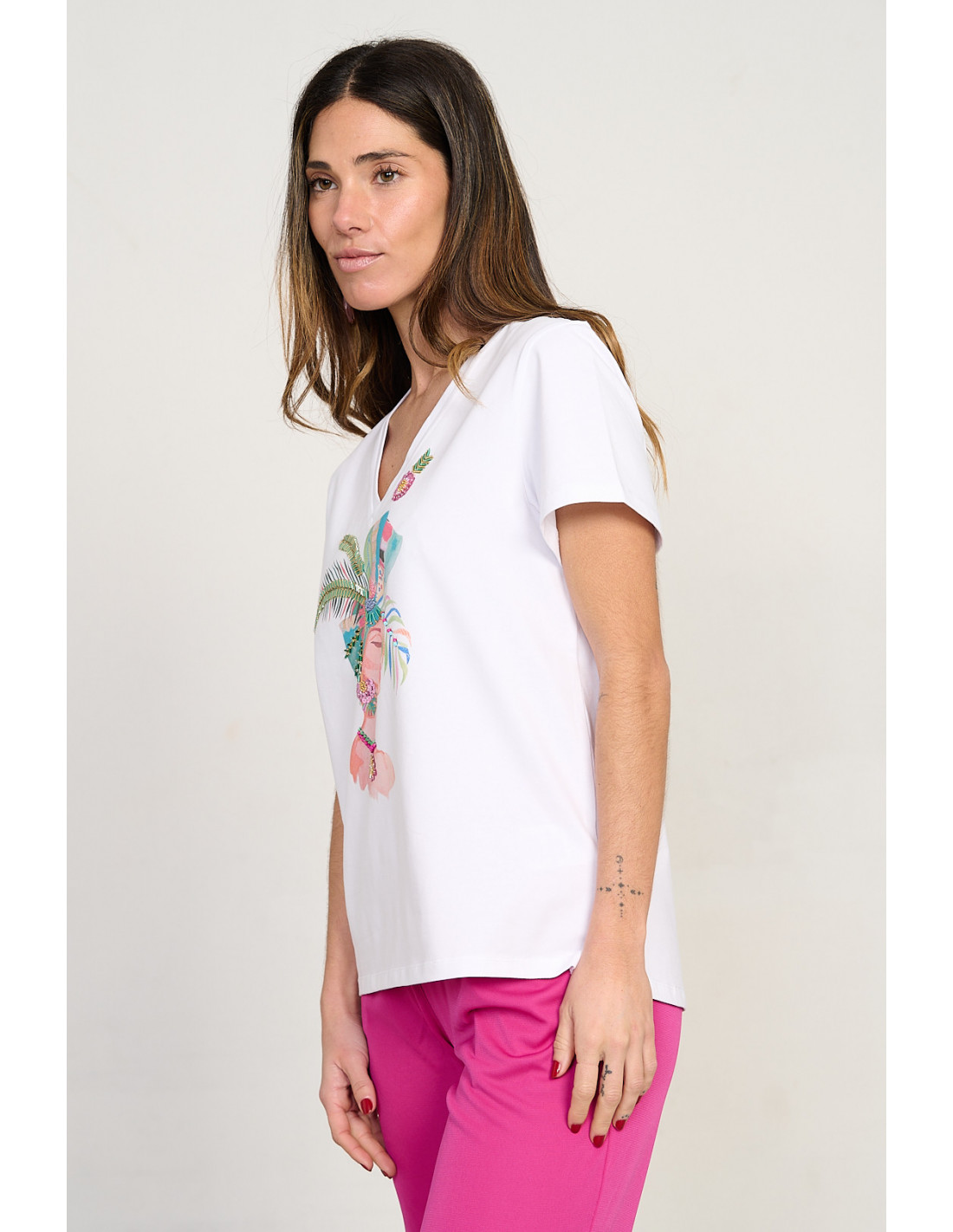 Renueva tu fondo de armario con esta camiseta de algodón, un básico con un toque especial. Su diseño presenta motivos de mujer decorados con pedrerías, añadiendo un brillo sútil y elegancia Con escote en pico favorecedor y manga corta, es la prenda perfecta para dar la bienvenida a la primavera.