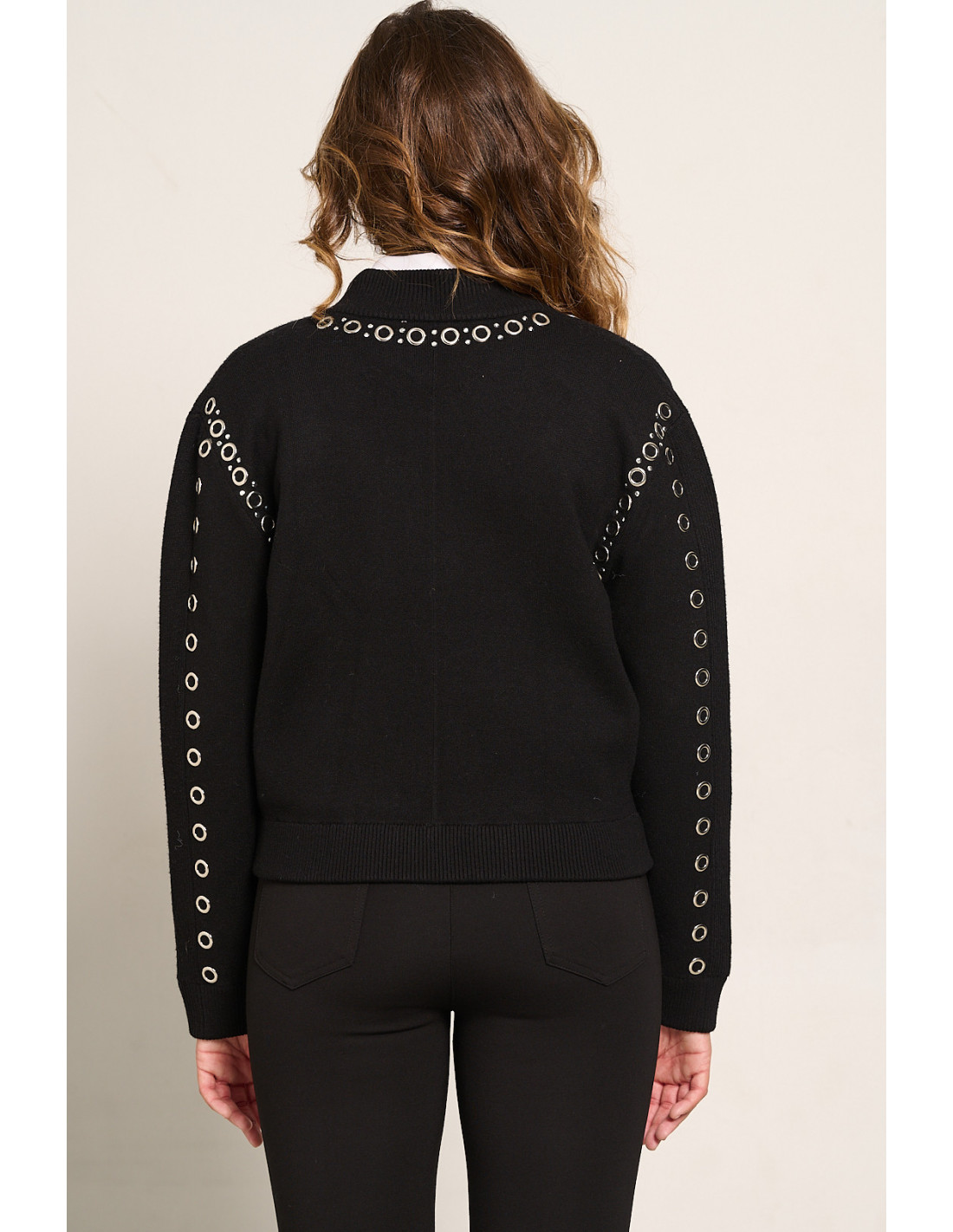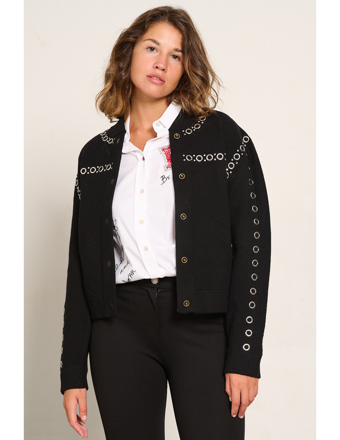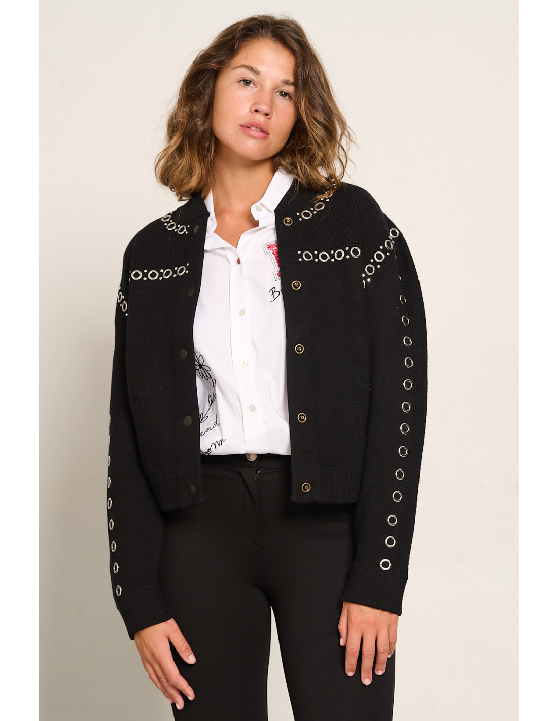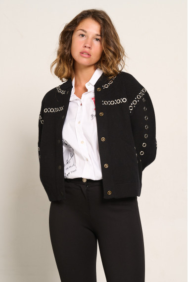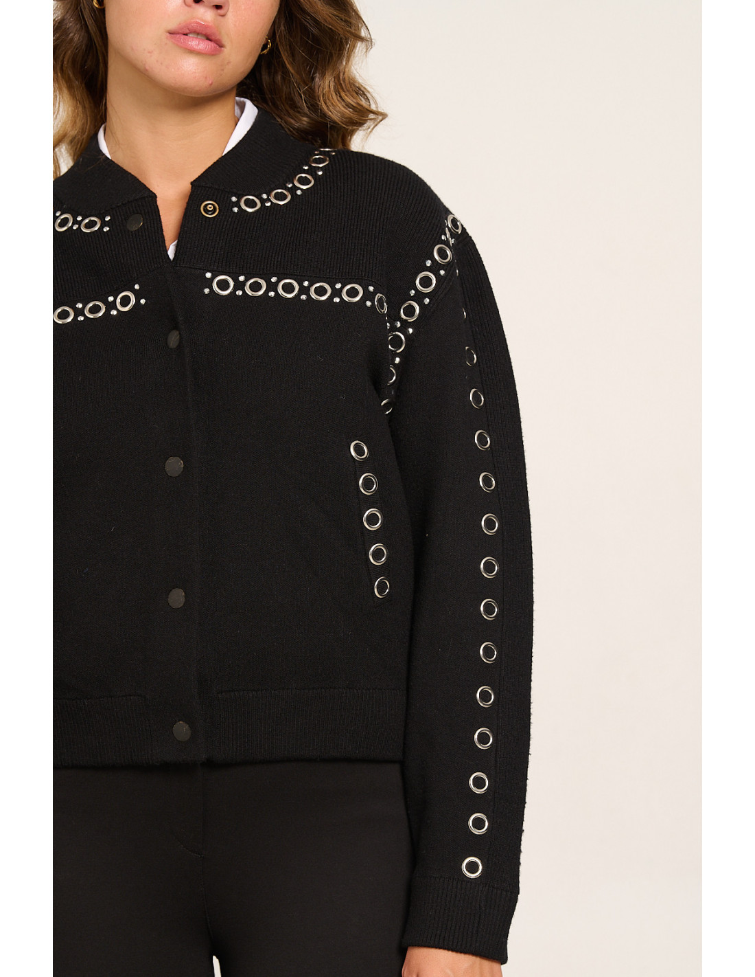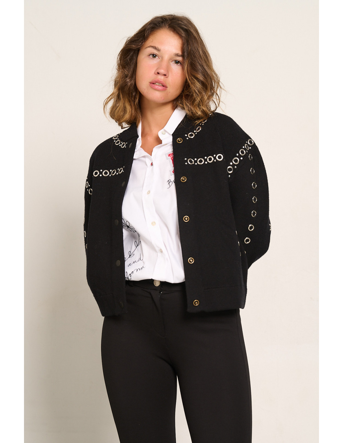 Renueva tu estilo con nuestra bomber de punto negra, un clásico reinventado con los detalles plateados. Un estilo urbano con un toque distintivo.