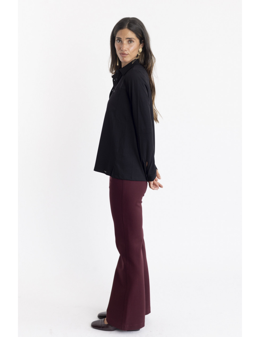 Este pantalón STORIES con cintura elástica está confeccionado en un tejido de punto roma con stretch que se adapta al cuerpo como una segunda piel. El diseño incorpora nervios verticales en la parte delantera, que estilizan visualmente la silueta y aportan un toque estructurado a una prenda extremadamente cómoda.