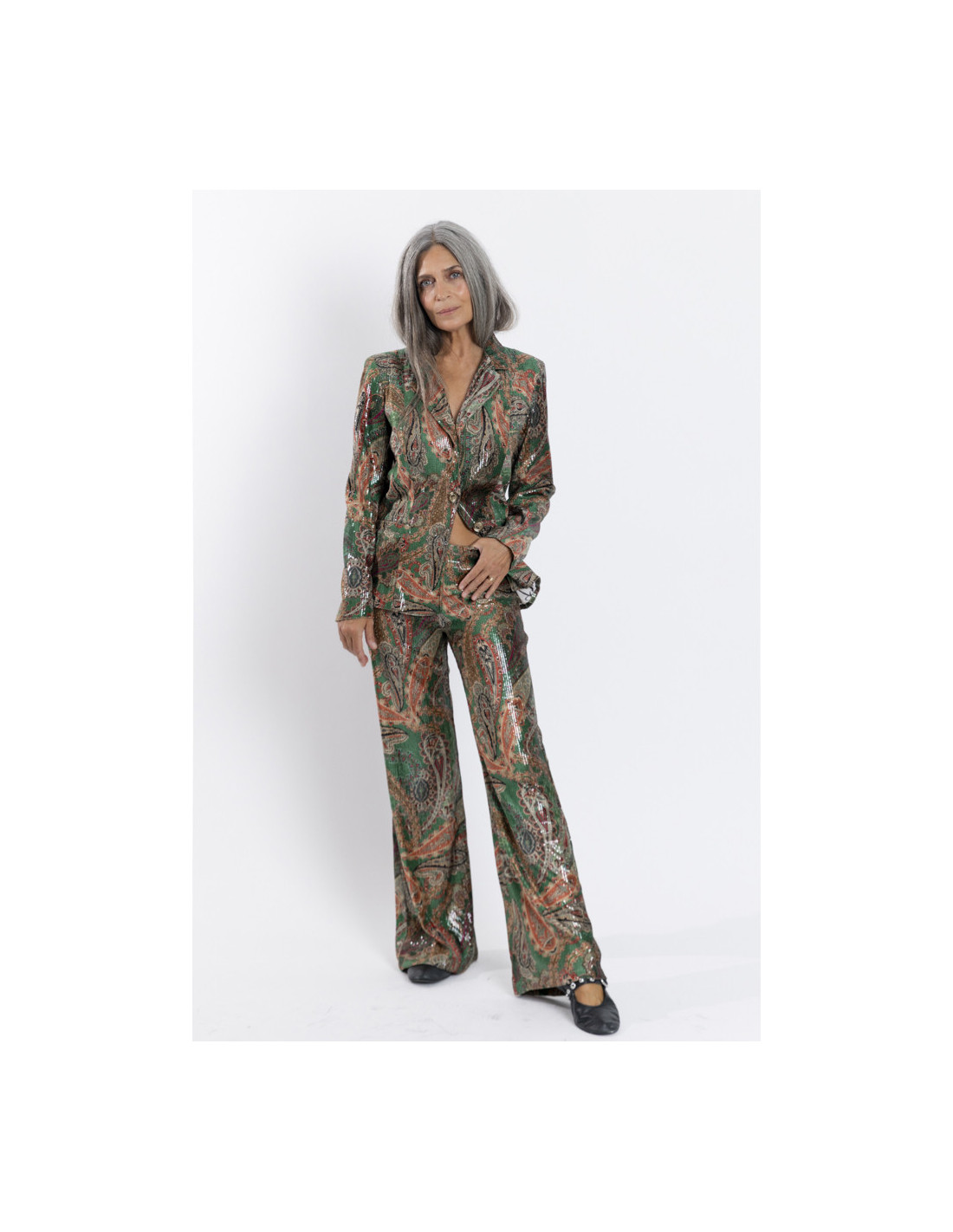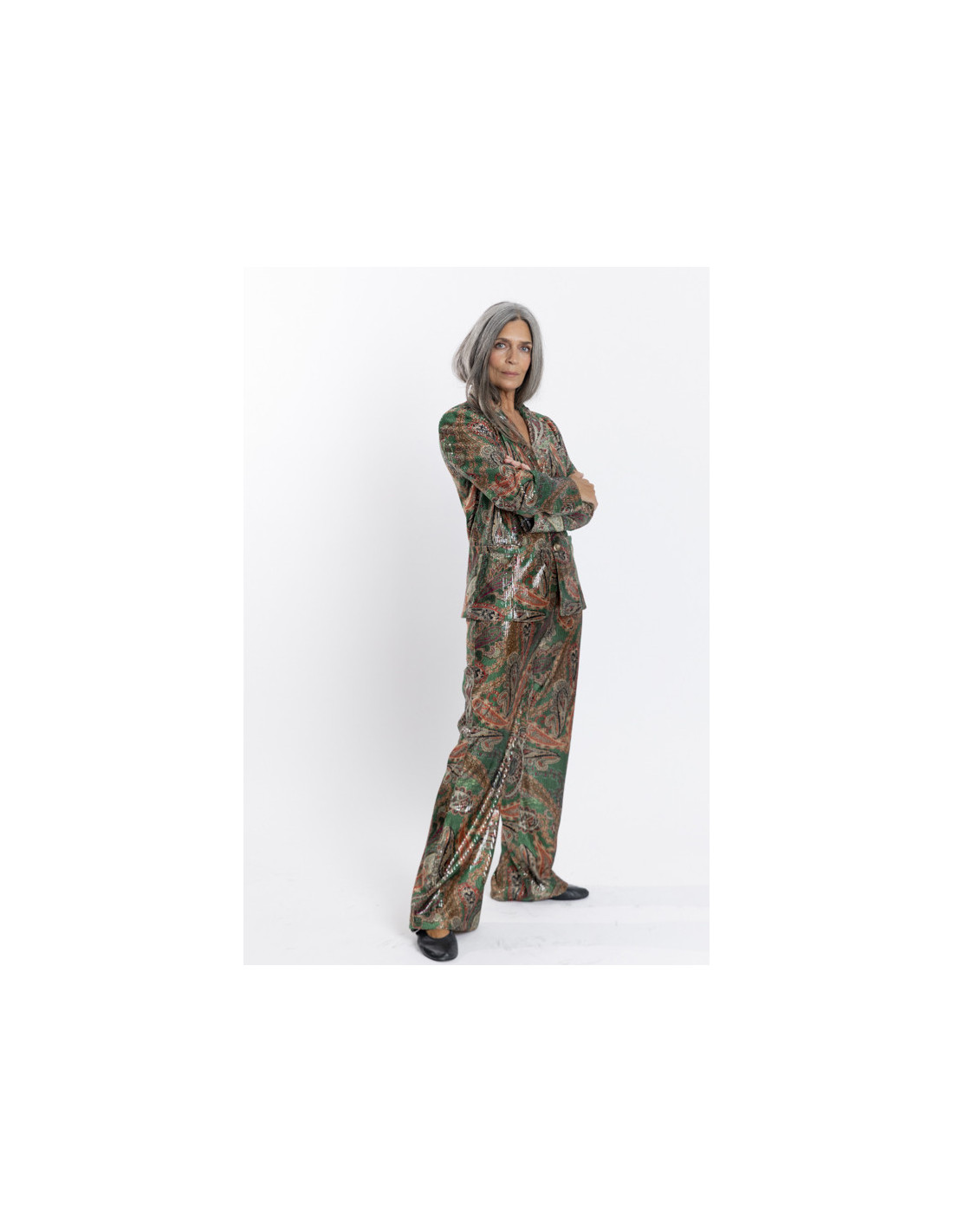 Una silueta atemporal con un giro inesperado. Este pantalón recto está confeccionado en un tejido estampado de cuadros y sutilmente bordado con lentejuelas transparentes que captan la luz con elegancia. Una pieza que equilibra lo clásico y lo especial, perfecta para destacar sin excesos.