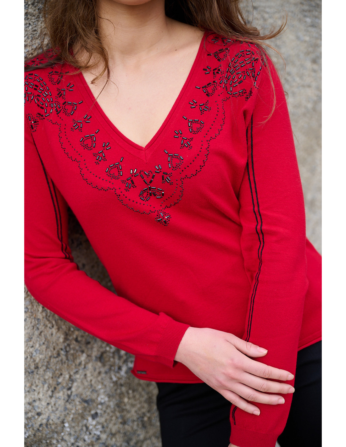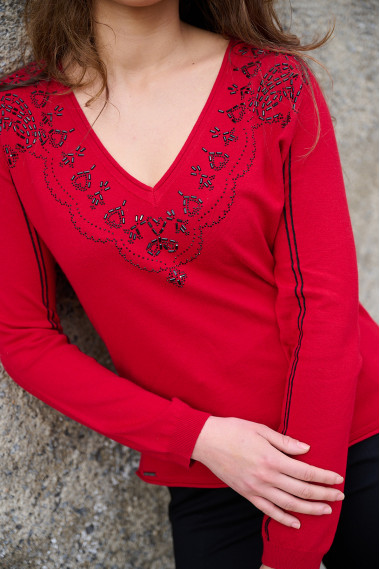 Este jersey en color vibrante te hará brillar en cualquier situación, elevando tu look hasta el máximo. Explosividad de color y detalle en el escote que hacen que esta pieza sea única.