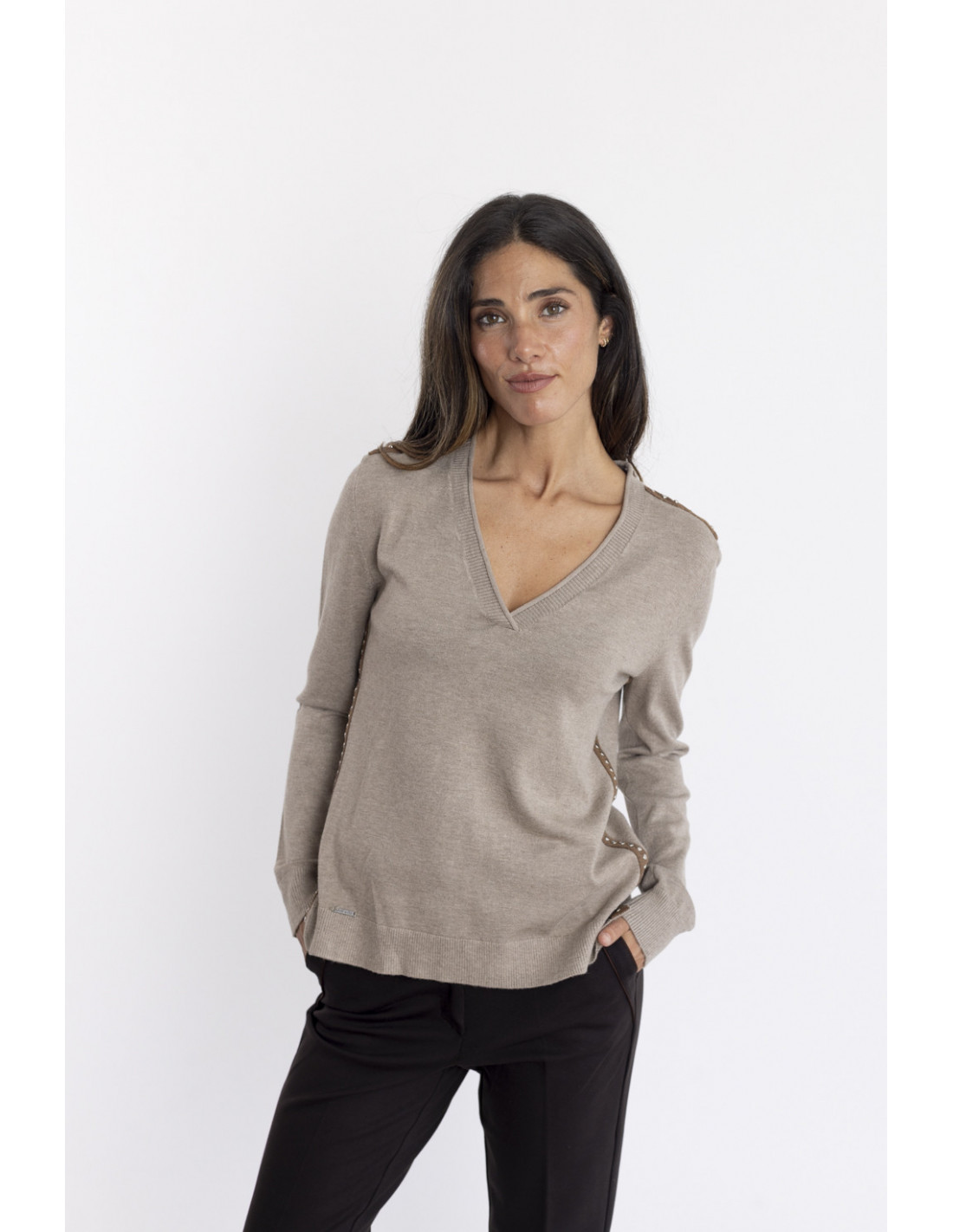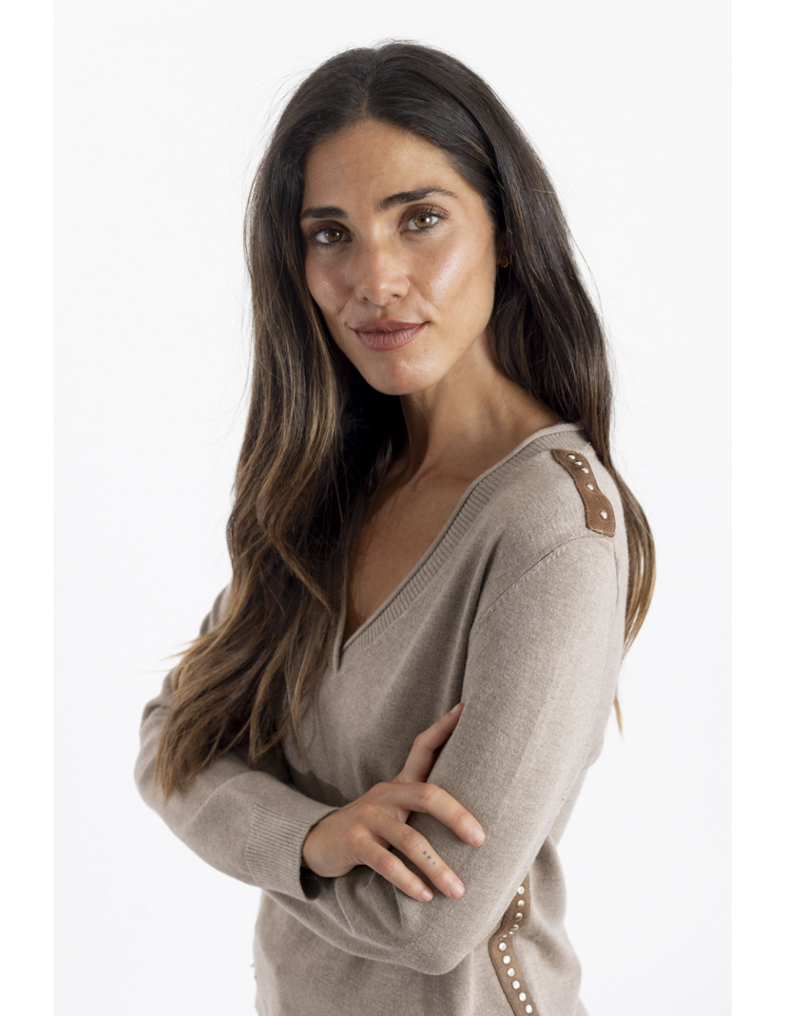 El jersey básico en un color otoñal como es el camel. Su escote en pico realza la figura, su textura extra suave hace efecto de segunda piel y no querrás quitártelo en toda la temporada.