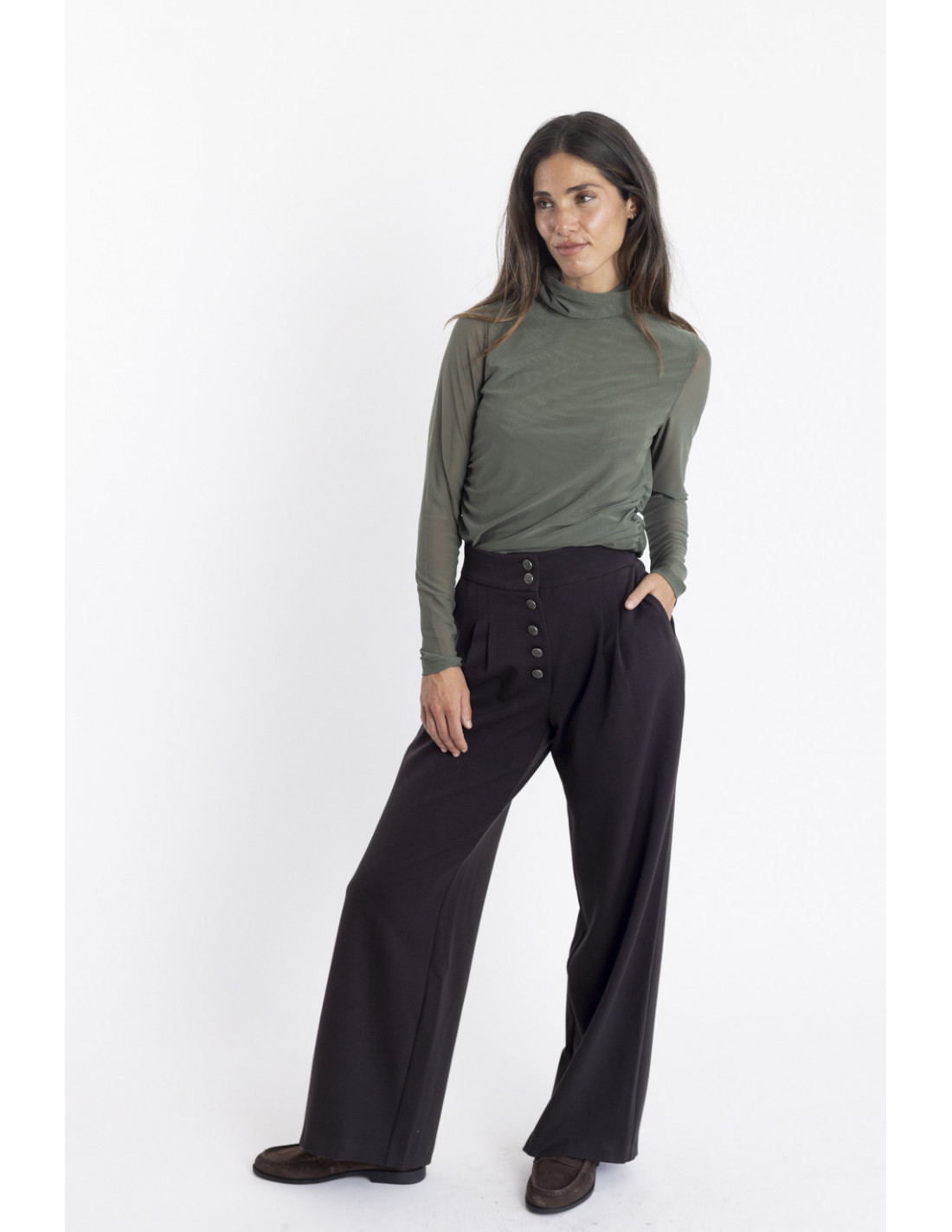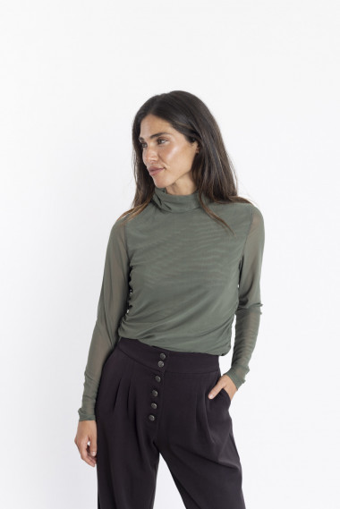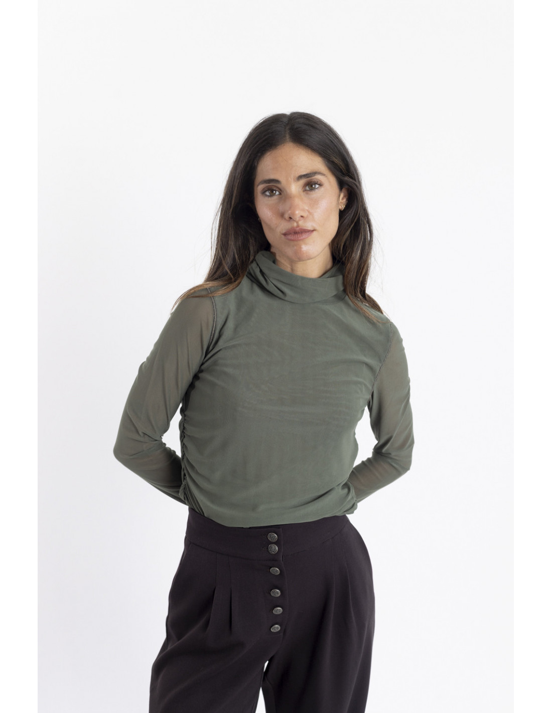 Un básico muy versátil, el top MONI. El delicado tul kaki y los detalles de remallado en la sisa hacen la autenticidad de este top.