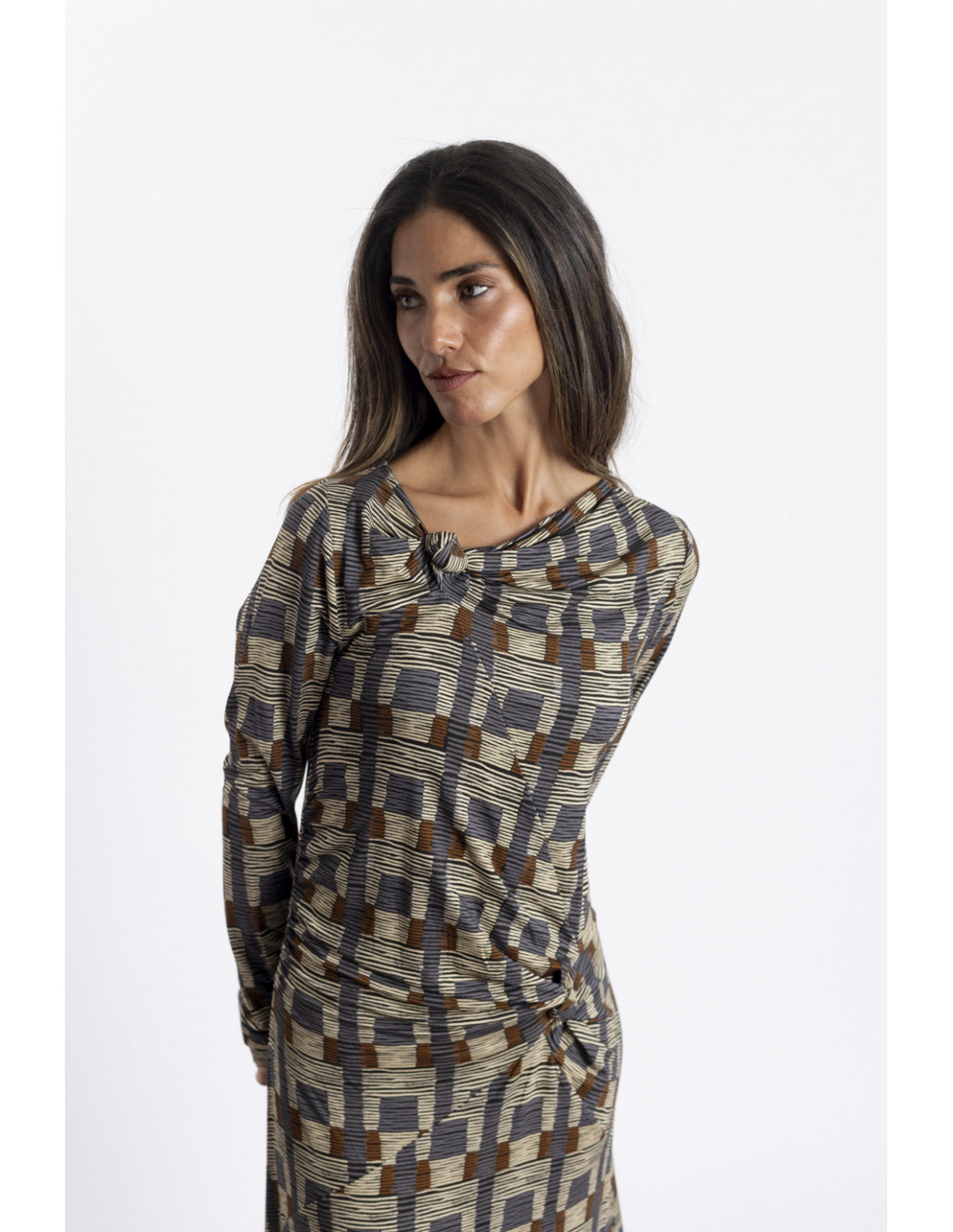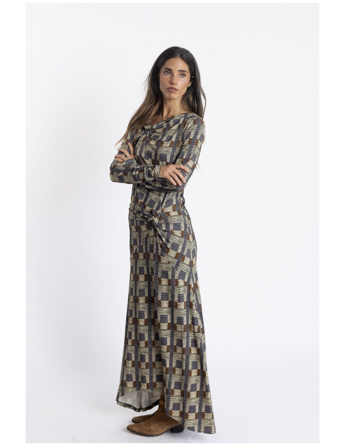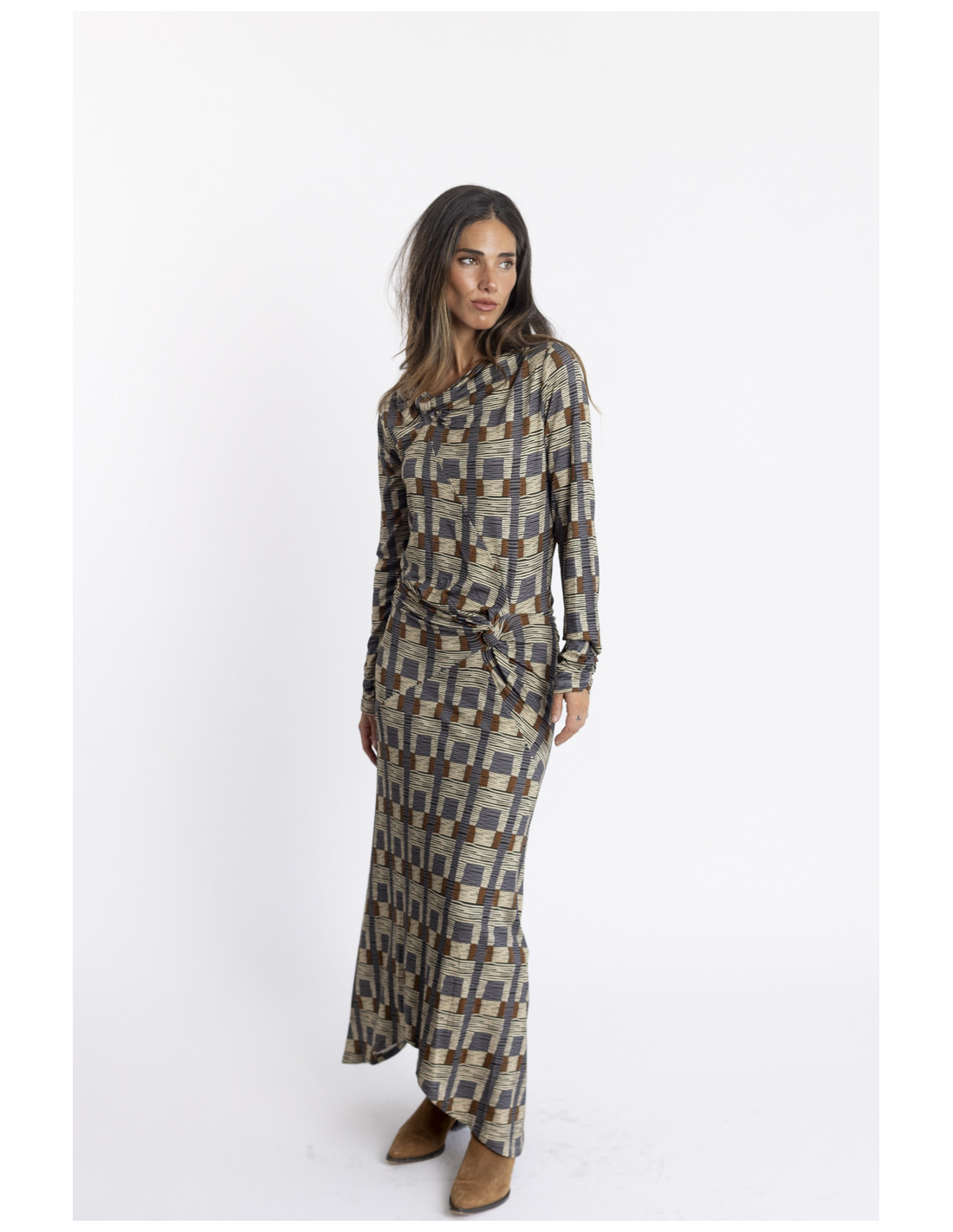 El vestido EKIALDE es un vestido midi que realza tu silueta gracias a su tejido con stretch. Los nudos en el escote y lateral aportan el detalle especial que lo hace único.”