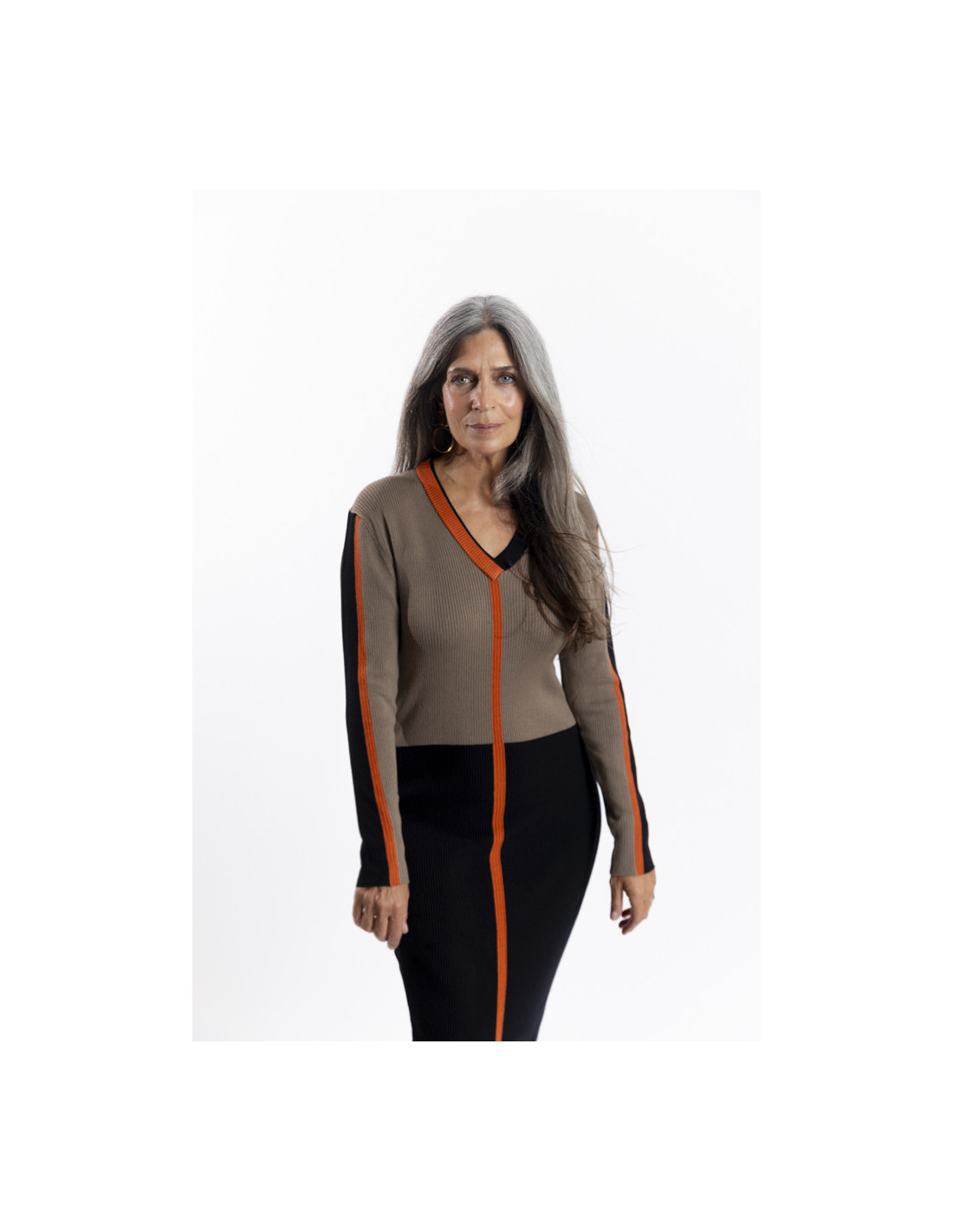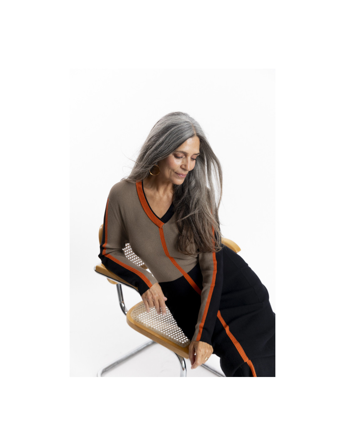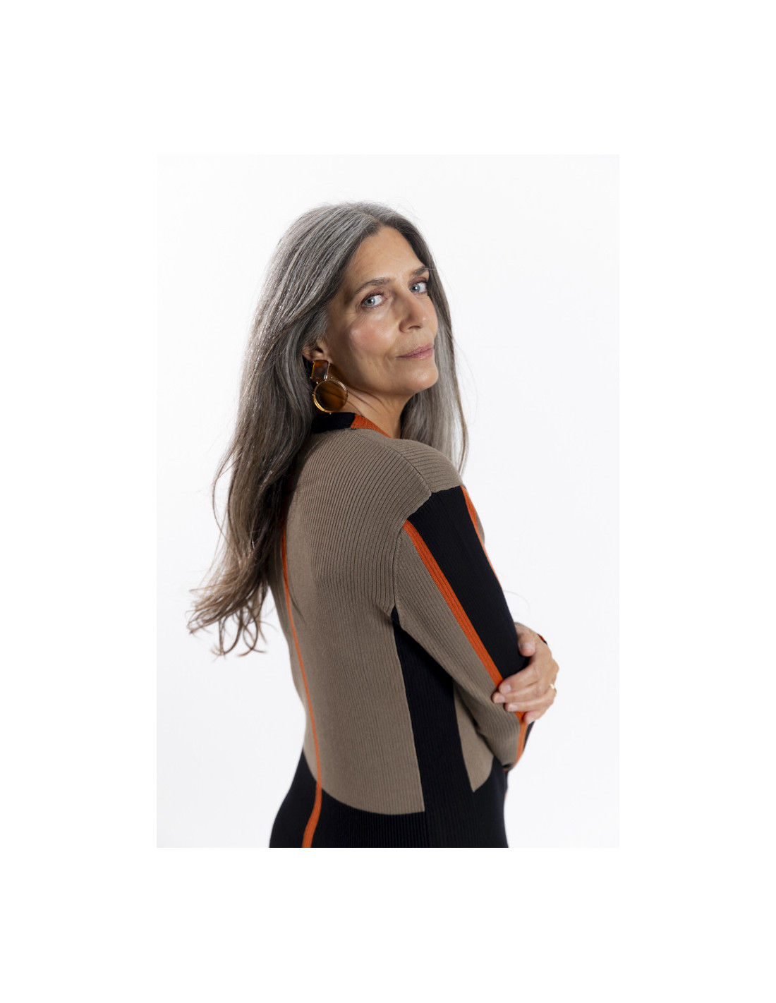El juego de colores en camel, naranja y negro lo convierte en una prenda versátil y vibrante, perfecta para destacar esta temporada. Los tonos cálidos y otoñales, en contraste con el negro, crean un efecto visual estilizador, ideal para looks tanto casuales como más sofisticados.