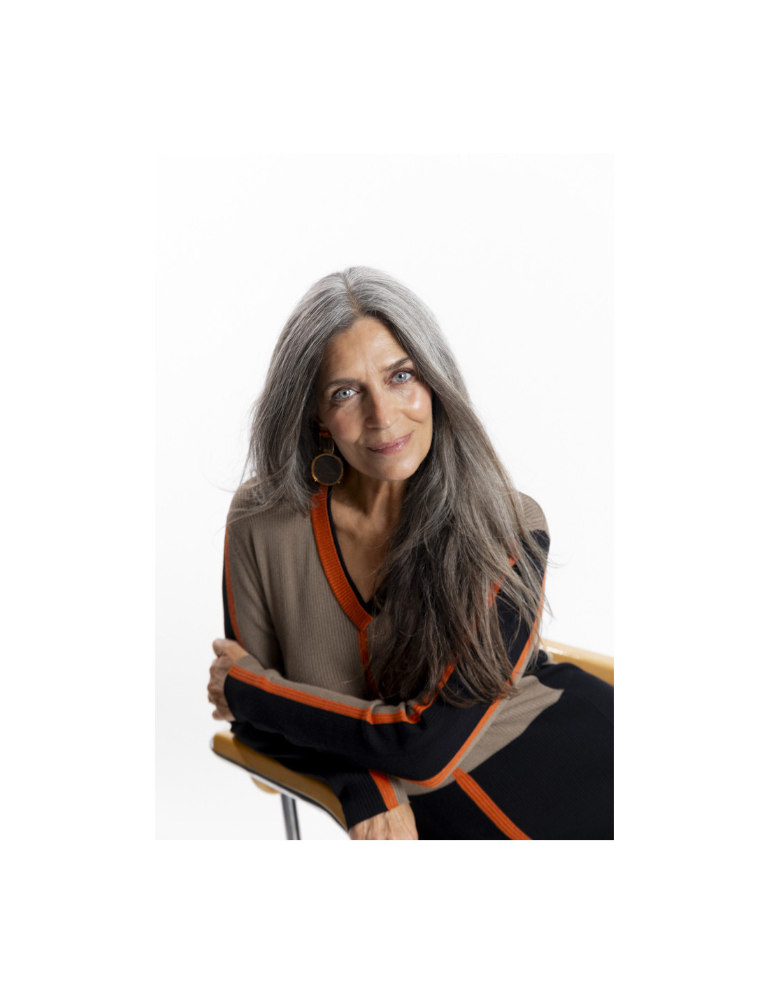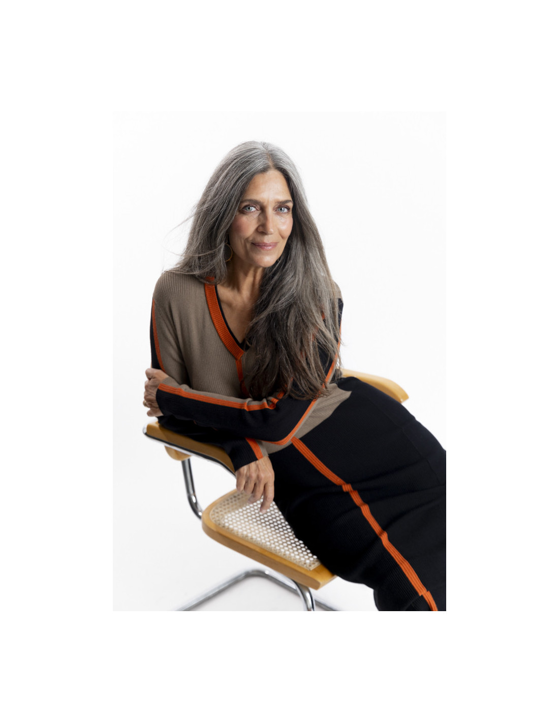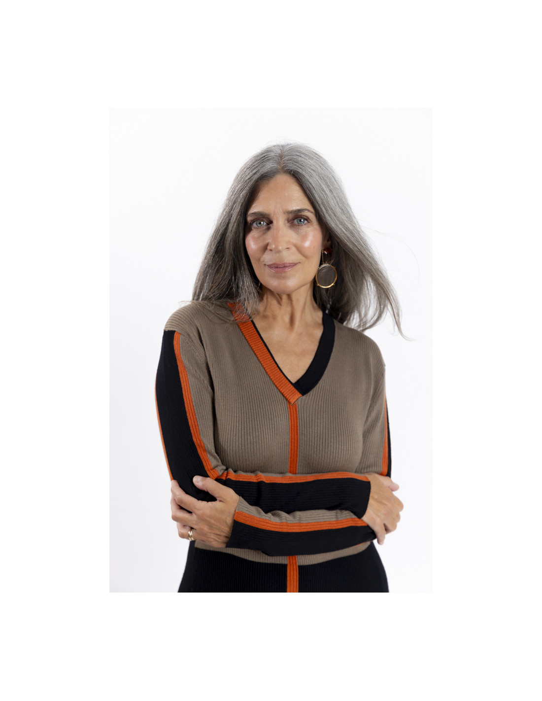 El juego de colores en camel, naranja y negro lo convierte en una prenda versátil y vibrante, perfecta para destacar esta temporada. Los tonos cálidos y otoñales, en contraste con el negro, crean un efecto visual estilizador, ideal para looks tanto casuales como más sofisticados.